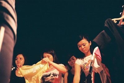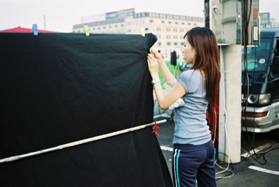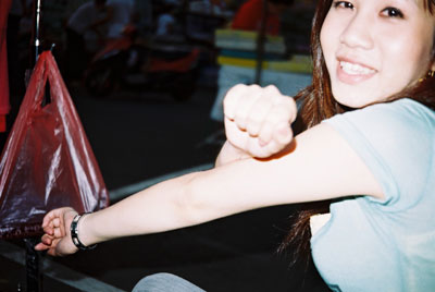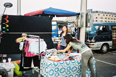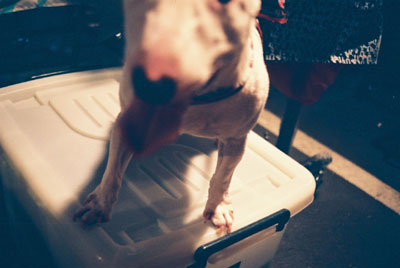 原本是為了要做劇本的角色研究,所以去看她們擺攤的實況,那天去的太早了,她們比預期要早把攤位架好了,我回家吃飯再回來後,人才多了起來;終於見到了周家那隻很像白老鼠的牛頭犬,是周爸跟周媽帶來的,他們常回來探女兒的班,好久不見周媽媽,我認不出來還以為是個客人,周少非說,哈姆是她們的開市犬,的確非常搶客人的眼珠;另外男朋友也有來探班,偶爾還能上場幫忙賣,可以加分。