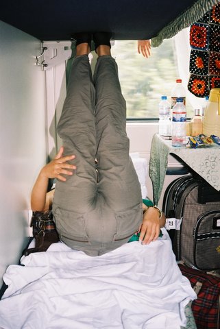 可以想像,坐火車有很多的時間都是在睡覺,我們這次訂的是硬臥,六個床位成一個小包廂,分成上中下,位子很窄,睡下去就差不多滿了,最尷尬的睡在下舖的人,平時床位是大家的公用椅一樣,就算是陌生人也會來坐,不過大陸人是還算親切的,也都還願意跟我們換位子,為了讓同團的盡量湊在一起,就跟了一群也是要到海拉爾的中年男子調過位。