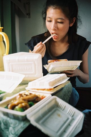 在火車上大部分乘客都吃列車上的鹹翻天餐盒,還好導遊楊姐有先見之明買了些泡麵跟保久乳,還有水果給我們換口味,另外在車上常常會有推車走來走去的賣零食,頻率之高實在是煩死了。