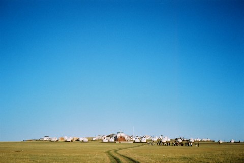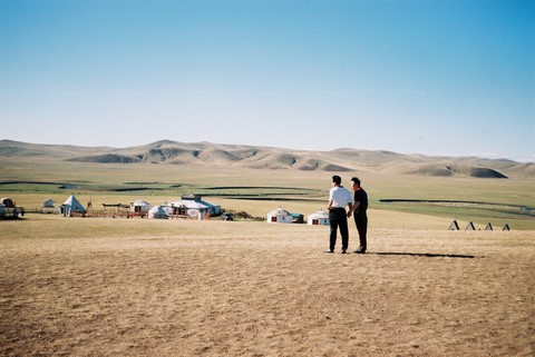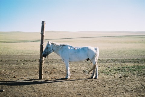 下了火車後直奔當天要住宿的蒙古包度假村(???),剛開始看到草原是很興奮,可惜聽導遊說我們來的時間晚了一點,草場已經黃了。一到那先去祭敖包,然後就是自由活動到處逛逛,本來要去騎馬的,但不知道為什麼他們不給我們騎,馬都很瘦,是標準的蒙古馬,臉都很癢,它們一直對著柱子磨襯,後來劉姿孝小姐摸了其中一隻頭馬,然後他就勃起了,非常的大,大的很噁心。